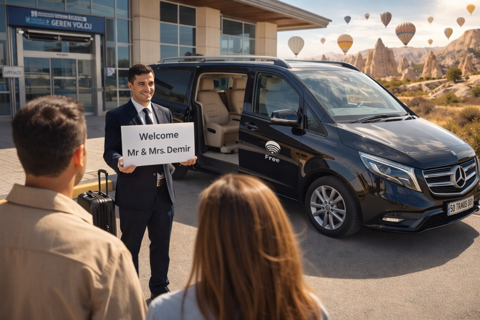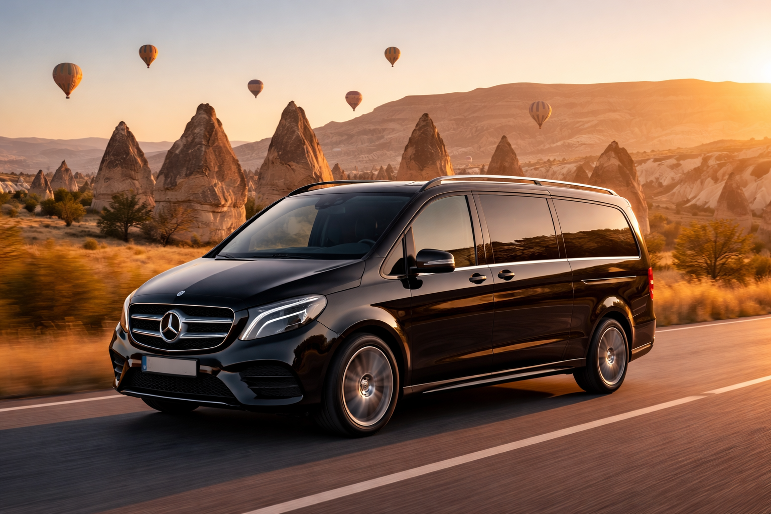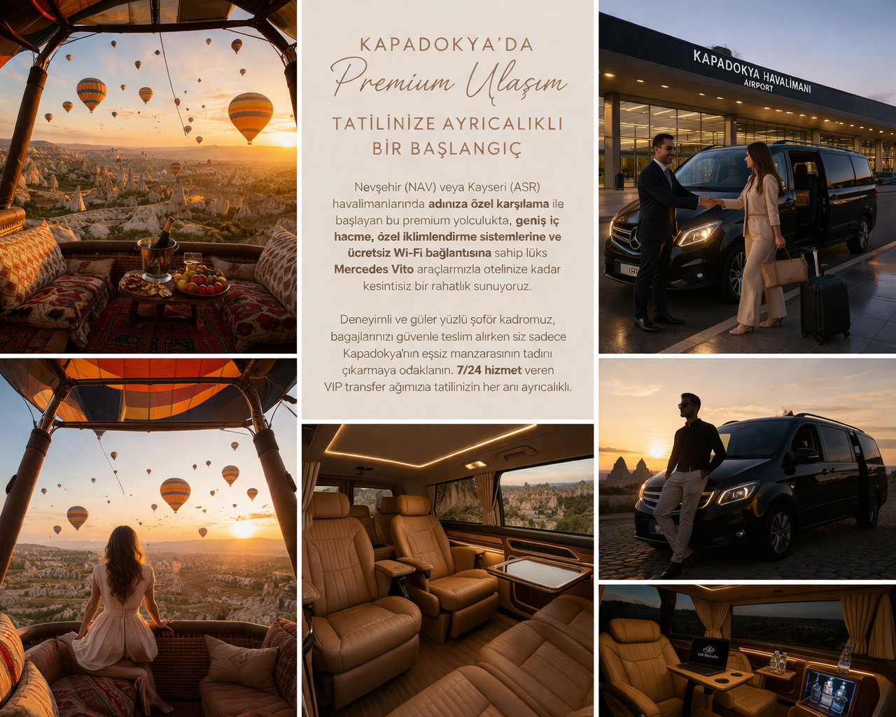 Nevşehir (NAV) veya Kayseri (ASR) havalimanlarında adınıza özel karşılama ile başlayan bu premium yolculukta, geniş iç hacme, özel iklimlendirme sistemlerine ve ücretsiz Wi-Fi bağlantısına sahip lüks Mercedes Vito araçlarımızla otelinize kadar kesintisiz bir rahatlık sunuyoruz. Deneyimli ve güler yüzlü şoför kadromuz, bagajlarınızı güvenle teslim alırken siz sadece Kapadokya’nın eşsiz manzarasının tadını çıkarmaya odaklanın. 7/24 hizmet veren VIP transfer ağımızla tatilinizin her anı ayrıcalıklı.